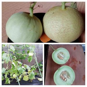コロタン🍈メロン 収穫、と言いたいけれど、残念なことに、枯れてしまいました……😭 網目が入った方は、固いけれど、少し甘くなっていて、剥いて食べました。もうひとつは、漬物にします。日照不足のせいか、根が張っていませんでした。
