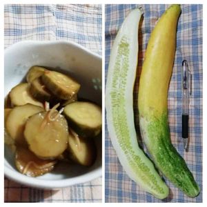 庭の🥒キュウリ 沢山採れた時作ったキュウリのQちゃん。ウマイ‼️😁 ご飯🍚にも、ビール🍺にも。やみつき😁✌️ 一本採りそこね。 変な色😅 皮を剥いて、糠味噌漬けに。冬瓜みたいで、美味しかった❗これもまたヨシ😆