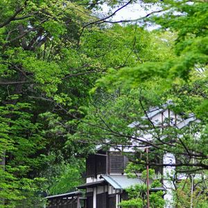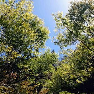 山奥自宅にて 渓流に架かる橋から空を見上げて 新緑の色んな色の緑に包まれて 快感