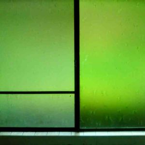 山奥自宅洗面所にて 午前7時半 洗面所に入り、雨なのにやけに明るいなと思ったら裏山の新緑 くもりが入っているガラスの向こうから新緑がアピール 雨だから一段と新緑が映えて