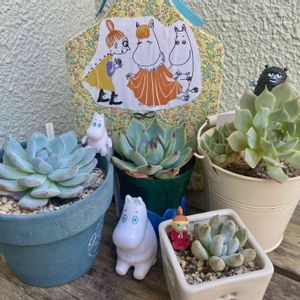 🏷ムーミンの日♡1周年おめでとうございます🎉 いちごみるくさんのデコパージュのムーミンボードで参加します🎶 暑さに負けず夏顔のエケベリアさん達です 子株もちらほら見られます☺️ 緑色でもそれぞれ違いますね💚