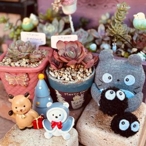 こんばんは🌙 🏷️毎月16日はトトロの日 まつぴよさんのトトロ&まっくろくろすけ💕 クリスマス鉢にはta29Gardenさんのスヨン 韓国鉢にはゴールドジャック おやつは無印のスコーンです🥰