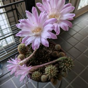 pic1 2023年12月に徒長して不格好になった株を思い切って胴切り✂️ 右側胴切り頭の方は今年初開花🌸 左側胴切り元の方はカット面周辺から子株が次々と出てボコボコ😅 pic2 胴切りする前の2023年4月、親株にできた沢山の鞘から種を採取し、興味本位で実生して、現在やっとこのサイズまで成長🌵
