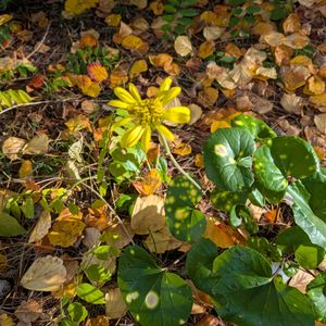 11.14 今の庭から… 黃葉した落ち葉の中で… 石蕗が咲き進みました… マルバマンサクは半分以上散り… 石蕗の葉っぱのアクセント… 庭石にも張り付いている… また少し季節の行進伝える…
