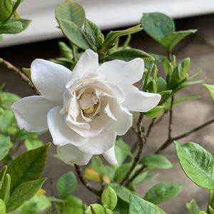 2020年の母の日のプレゼント🎁に 息子から貰ったバラ咲きのクチナシに 今年一番花が昨日咲きました🌸🪴 2022年に植え替えてからず〜っと 葉っぱが黄色く枯れ枝も出たりと イマイチ調子悪かったのですが鉢の 表面に今年2月頃鹿沼土を入れたら あれよあれよと言う間に葉っぱが🌿 緑に復活して蕾までつけて 開花にこぎつけられました🌸🪴