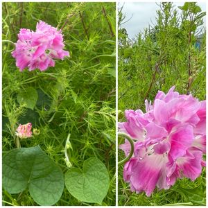 🌸ピンクの西洋朝顔 スプリットペダルが美しく咲いています コキアがすぐそばにあるので絡みついています😅🌱 色々な種をこの辺りに撒き移すの忘れ放置 でも綺麗に咲きました 大好きな花😘 💗フリフリがなんとも言えません 花びらは一重だったり八重だったりと これは一番花びらが多いほうです 右はちょっと近づいて📱💗🌸 💚葉は可愛いハート形です💚