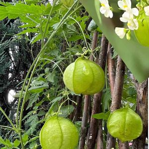 時折雨模様です☔️ 今日の花 💚フウセンカズラが可愛らしい 上の方に花と蔓ががもじゃもじゃ 絡むところが無いので自分で絡まっています😄 提灯をかざしているようにも見えますね 🏮💡🎈