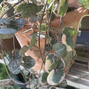 💚斑入りのハートカズラ 蔓の下の方に斑があるので持ちあげて斑のある所を撮りました😊 葉は厚くて元気ですね🎶 🌞夏になるといつも思う 生き残った多肉を大事に育てようと 🍁秋冬になって可愛いく色づいた多肉を見ると夏越しの事チラッと頭にあるのにまた鉢増やしてしまいます お店に行かなければいいのにと思いながら会いに行くのね😨💦 💕多肉の色気に負けそうな自分🍀 ムムム気をつけよう😣