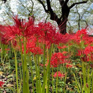 今日のお花 ヒガンバナ 🌹赤い絨毯 土手が真っ赤です 赤い範囲が年々広がっているようです ❤️花の下地面から上を見上げて撮って見ました 空と桜の木 ヒガンバナのコラボです😊