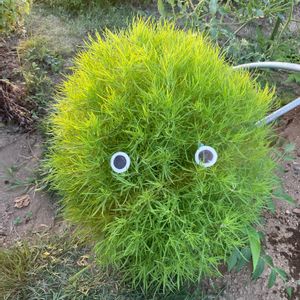 🍀畑のコキア🌱に👀を付けました♪♪ いつか目を作って付けて遊びたいと思っていたので嬉しいです♪ 目を付けた位置が近すぎたみたい なんか情けない顔に でも可愛い 😍 丸いお顔に 夕日を浴びています🦠 もっと大きくなったら耳を作ってあげるねと約束しましたが出来るかな?