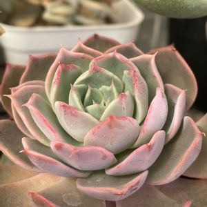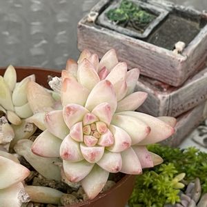ミニベル錦の色づき😍 ほんのりピンクに染まっていい感じ 棒が伸びたようで形が悪いです ミニベルは上に伸びたい多肉さんなのね 🌸上の子がとっても可愛らしいピンク🎶