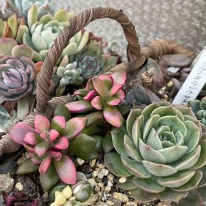 ❄️寒〜い 籠の中の多肉さん達 🌸桜吹雪のピンクが可愛らしい 斑入りグリネさん小さくなって残っています٩(^‿^)۶ 右の多肉さん う〜ん名前は?🧐 札だけ見えてるシムランスラグナさん小さくなって後ろに隠れています😆