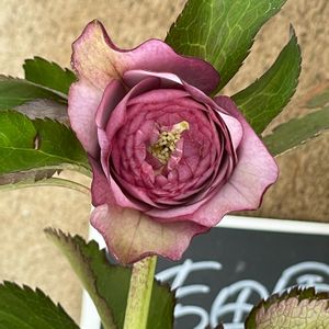 🌸やっと開いてきたクリスマスローズ 💤寝かせて撮りました😅💦 💗昨年は優しいピンク色だったのに今は濃いめピンク もっと開いてくれば変わってくるのかな? 吉田園芸さんの超多弁です