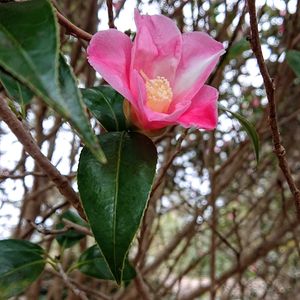 小さな母の庭 もうひとつ咲いていた 🌱ワビスケ 侘助ツバキ ツバキ科 ツバキ属 年末から薄いピンク色の花弁で半開きにしか咲かない控えめな椿です 母がお友達からのひと枝を挿し木して半世紀以上も咲いている。