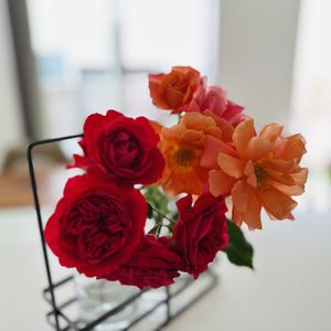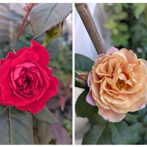 1. ロサオリの強い薔薇の先駆けといえば🌹マイローズ❤️その花が咲き始めました〜❣️ ようやくお迎え出来て 驚いたのは 色❣️ 普通の赤薔薇🌹をイメージしていたら 違った‼️ 光が透けるような 透明感のある 輝く赤なんです‼️ 花は思っていたより小さいけれど お気に入りの薔薇になりました❤️ 2. ジーンティアニーとマイローズ 3. ピエールドロンサールのスリップスに耐えた子 4.この子の名前知りませんか? 5.まだ咲いてくれた アブラハムダービー この芳しい香りたまりません🧡