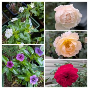 左上から時計回りに マイローズ アップルジャック クラウン プリンセス マルガリータ プリンセス アン 昨秋、工事のためやむなく地際まで切り詰めたアップルジャックも咲いてくれました😊