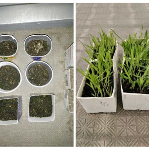 2025年 4月 8日(火) 16時 46分 撮影 ベランダ組さん〜 🌿 猫草栽培 2週間が経ち やっと出てきた🌱 𓂃𓂂𖠋*゚ わんにゃん もう少しのお待ちを 🍀 ☺︎︎︎︎