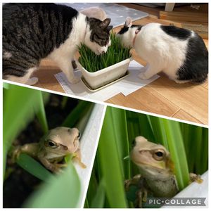 毎月6日は カエルの日🐸 今年の暑さったら… カネのなる木も あちこち焦げてしまいました 今年は会えそうもない😞と 思ってたら 娘が写真を送ってくれました🎶 「猫草🌱のプランターに ケロがいたよ💕」 食べる前に逃して そのあと カイ&ハチが食べてます😋 🐸さん 可愛いです😍💕