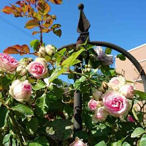 濃い青空に映える CLミミエデン🌹🌹🌹 ピンクとホワイトカラーの小ぶりの花がキュートだわぁ〜💕
