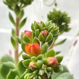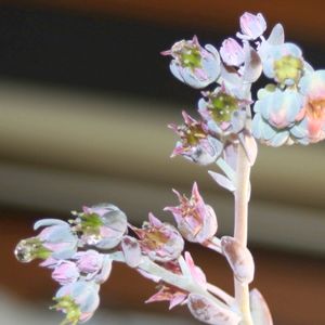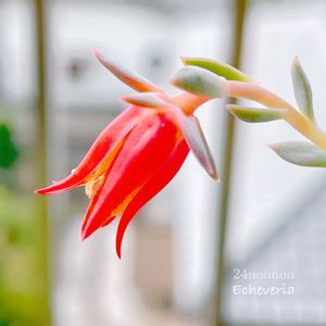オレンジ色のエケベリアの花が咲き始めて ゆっくり可愛い花びらを開いてきました 新宅の寝室の窓辺で、頑張っています