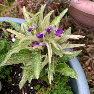 斑入り葉の菫 お迎えしました 綺麗〜🌿💜 取り敢えず 鉢植えに。 増えますように🙏 奥に見えるのは、 クリロー氷の薔薇 今年半額セールで😍👍