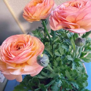 ラナンキュラス 小春びより 三つ咲いています🪷🪷🪷 ①1月14日に 投稿してからずっと咲いてる ②ニ番目 開きかけ ③三番目 色付いた蕾 あとかたい蕾がふたつあります 一つの苗で 華やかლ(^o^ლ) 🏷️金曜日の蕾たち 参加します🙋