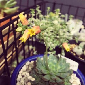 こんにちは✨😃❗️ 朝は雨☔️降ってましたが、昼頃より晴れ☀️てきました🙌 1.5cm位の多肉ちゃん、小さいのに花が咲いてます💞可愛い❤️です😃