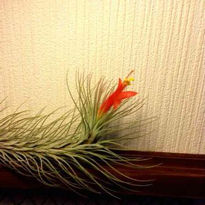 まさか咲くとは思ってなかったフンキアナ 図鑑でみた通りの朱色。 #ティランジア #エアプランツ #フンキアナ #ベネズエラ #開花 #朱色 #オレンジ色 #tillandsia #funckiana #venezuela #メイクマン