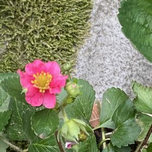 こんにちは♪ 今年の春に黒田園芸さんかで求めた ピンク💗色のお花の🌸いちご🍓です。 こんなに暑いのに、可愛い🩷お花を咲かせ、①② 実をつけています③ しばらく様子を見ていきたいと思います☺️🎶
