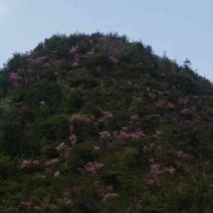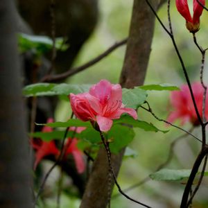 深い山の登山道。 緑の中で赤がひときわ目立っていました。