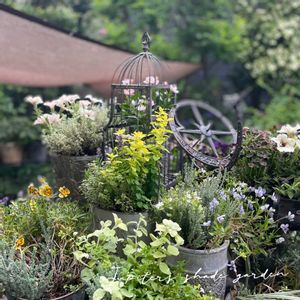 いつものガーデンテーブルを 後ろ側から撮ってみました。 pic2 バードケージ入りミラモネは カゴからはみ出して咲かせてみたい。 pic3 ペチュニアのカプチーノは初めてですが 一重は咲かせやすいです。 クリスマスローズ用にターフを張ってます。 今年はこれで夏越しを克服したい😤