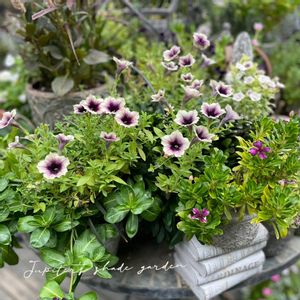 暑さで元気がなくなってきた ペチュニアヴァンサンカン、 ラベンダーベール🌸 弱った部分をカット✂️して 庭のヒューケラやシルバーリーフと合わせてリメイクしました♡ 花数は少なくなりましたが、 綺麗に咲いてくれています .ꕤ*.゜