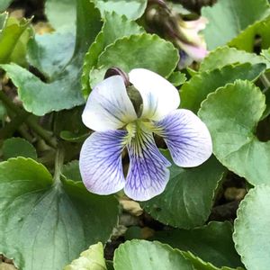桜ヶ丘公園 アメリカスミレサイシン(ソロリア・ プリケアナ)、スミレ科)スミレ属の多年草 🌼花言葉 「豊かな恋」 🌸帰化種、花は白を基調に中心部が紫色 🌸丸葉で花柱が見えない,花弁に毛がたくさん生え,距は短く太い,花は大きめ