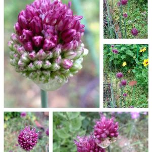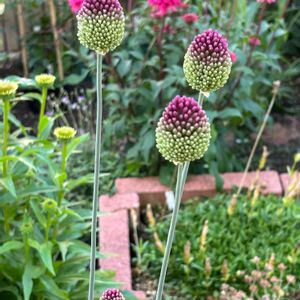 アリウム丹頂が色付き始めました😌💓 細〜い茎にカワイイネギ坊主さんのようなお顔🎶🎶 6~70センチに長く伸びた茎が折れないかと心配しましたが意外と強健です☺️🙌 後ろは我が家のポタジェ🍀 混み合ってます😚