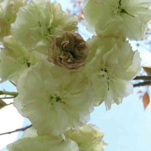 4月の桜🌸 須磨裏普賢象。 フリル八重と2段咲き八重、スモーキーカラーの黄緑、大輪。 園芸界、流行りのスモーキーカラー。 こちらは2段咲きの花も付く進化系です。 ちゃんと紅変しますし、普賢象の牙(葉化した雄しべ2本)もあるよ。