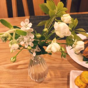 近所のカフェで買ったブーケの植物をプラスしました♪すごく可愛いお花たち…癒し… アルケミラモリス、アストランティア、レースフラワー、ホワイトスター、etc etc