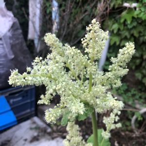 ルバーブの花です。 ほんとうはカットすべきなのですが、 ルバーブが増えすぎなので咲かせました😆 薄緑が綺麗です。 でも、香りが栗の花の香りに似ていて😑