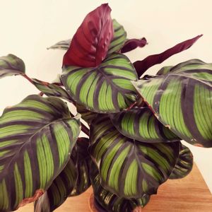 カラテア・ムサイカ斑入り 購入してから2ヶ月で葉が6枚増えた😮 ウチにある植物の中で成長速度最速かも 斑入りのいい所は、次どんな斑が入るかな、という楽しみがあるとこですね( ´ࠔ`* )