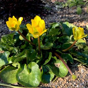 植えた覚えないヒメリュウキンカ (… おそらく … たぶん ) 😄🎵 お日さまに当たり ツヤツヤ✨ 隙間がお好きなようですね😃