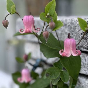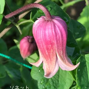 今年購入したクレマチス・ソネット 思ったほど大きくならず こじんまり、かわいらしく咲いています ふくよかな 姿が良い壺型クレマチスです