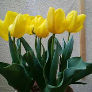2024.3.12 黄小町チューリップちゃんが開花しました。 新鮮な黄色🟡カラー元気もらいます✨ 何ヶ月か前に育てたメリープリンス(ピンク)よりも背丈が低く、カワイイです。