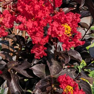 🏷 真っ赤な火曜日 🏷 あっ火曜日 サルスベリ ブラックパール レッド🔴 真っ黒な銅葉に真っ赤なフリフリ花弁 黄色いシベがポイントです✿“ヽ(´︶`*)ノ”✿