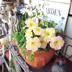 今日つくった寄せ植えです。 春らしい色にしてみました。 100円のペチュニアがすごく可愛い色🌼他のリーフやローダンセマムは見切り品のオンパレードです🤫
