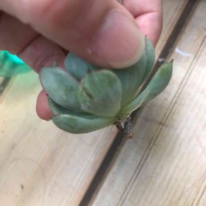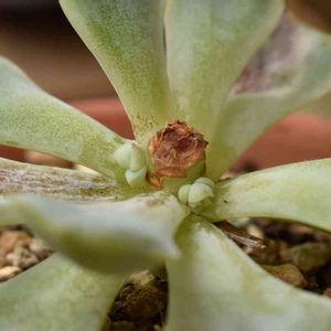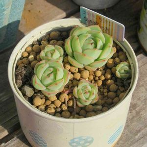 こんにちはヽ(・ω・)ノ 梅雨の間に徒長してブサイクになったエケベリア(魅惑の月)さんをベランダで養生中の9月9日🍃🌀☔ 台風15号により鉢が吹っ飛び、上半分辺りからもげてしまいました(>_<) もげてからひと月半。小さな子株7つを確認!! 親株さんには、可愛そうな事をしてしまいましたが、子株ちゃん!!頑張って大きくなってq(^-^q); ※徒長姿はみどりのまとめに載せてます💧 2019.10.20 ベランダにて📷