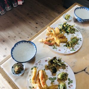 お昼ご飯 しら粥 蕗味噌(摘み立ての生の蕗の薹刻み 生味噌と混ぜた) 天ぷら、塩 ズワイガニ、蕗の薹、菜の花