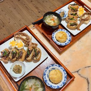 朝ごはん おこわ、稲荷、 干し貝柱、炊き込み ロースト胡桃、後から混ぜた。 醤油味を見ながら4.5回回しかけ トッピング、椎茸、菜の花 ゆで卵星型カット 高野豆腐、干し筍煮〆 豚汁 人参、大根、里芋、豚バラ、だし 麦味噌 蒸しパン オレンジ味