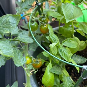 ミニトマト、ようやく初収穫です 大きさ、見た目はとても良い感じ 実のつき方がまばらなのが心配です 鈴なりに沢山実らせてみたいものです