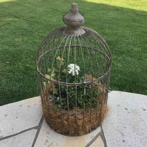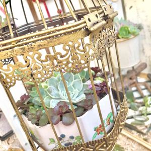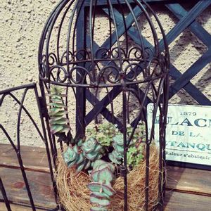 ガーデニング雑貨のお店でみつけて一目惚れした鳥かご。 多肉寄せるか悩んで、今回は葉っぱを。