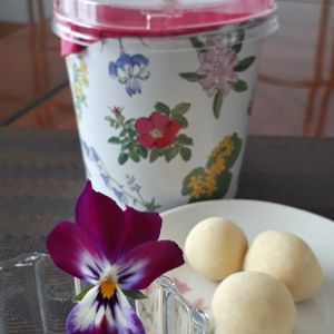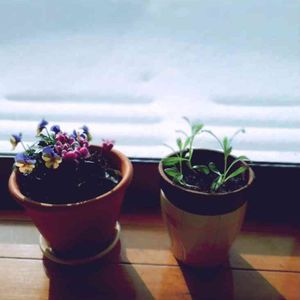 吹雪いています… 窓の外では白い風が渦を巻いています 今日も読書 オジサン顔のビオラと 六花亭の苺チョコをお供に🍓