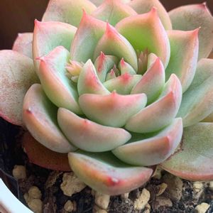 桃太郎の花芽🌸♪ モルタル寄せ植えのこの子は雨晒し、雪ざらしでも大丈夫👌 さすがに-10℃はダメだろうと寒波前にいれたら、可愛い花芽ちゃんが💕💕 多肉ってたくましい👍に